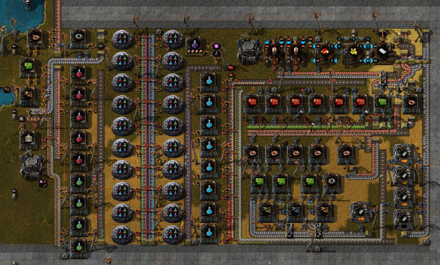 3. Hordes of Large Biters/Spitters during the Green/Blue Science Phase (6-10 hours) makes the game pretty unbeatable, and their composition means even a peninsula build would be overwhelmed with enough time. We had to research up to blue Bullet Damage & Turret Damage, build a dedicated belt-fed line of turrets around our base AND automate production of RobotArmy's Battle Droids and even they were barely allowing us to hold our ground, we didn't even have the research for rocketry yet! We ended up losing an entire save due to it. Our factory wasn't particularly productive, just the necessary power generation and resource mining to run one of these Automated Blue Science setups (~20 Steam Engines, ~20 Drills, ~30 Furnaces). For reference; we barely reached Laser Turrets and started producing a handfull of them before the literal 80-strong horde of Big Biters/Spitters overwhelmed our dedicated belted turret line.