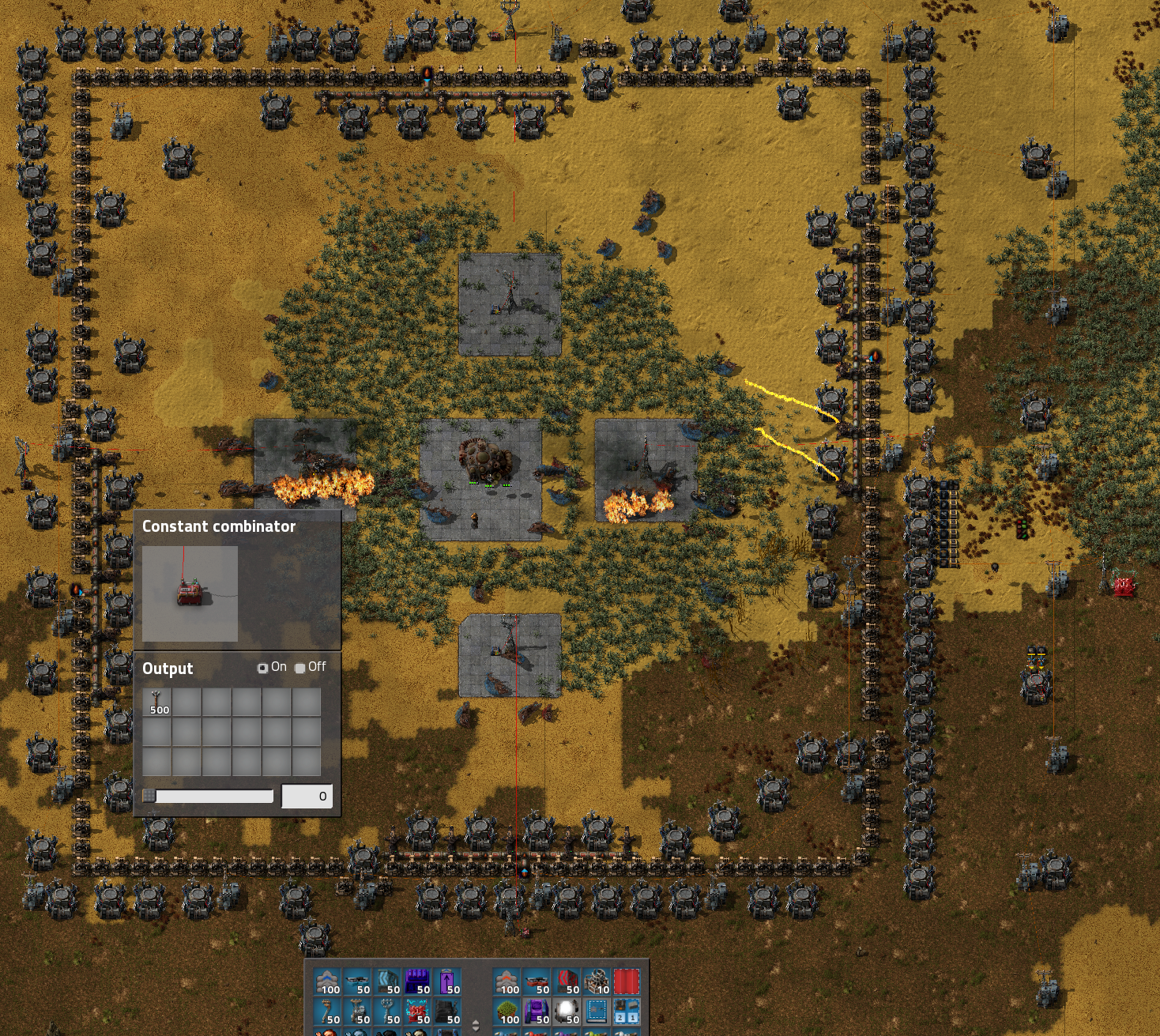 Meanwhile, within the flamethrower turret range I have placed four circuit-controlled requester chests, configured to set requests from the circuit network. Four constant combinators are provided for configurability although it would also be possible to set these requests dynamically. Eventually the biters will cross the path of the chests (frequently, because they are chasing logistic bots who have come to drop off the requested objects), and the flame-thrower turrets will destroy the chest. Then construction bots will replace the destroyed chest and the cycle will continue.
